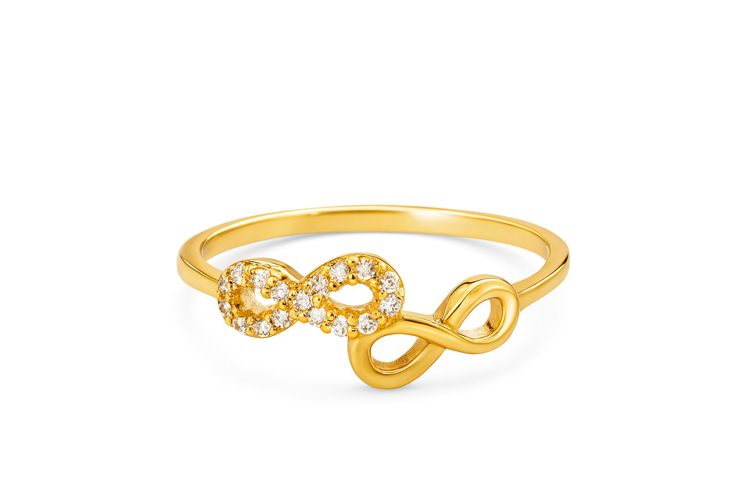 Anel 2 infinitos vazados em ouro 18k com zircônias.