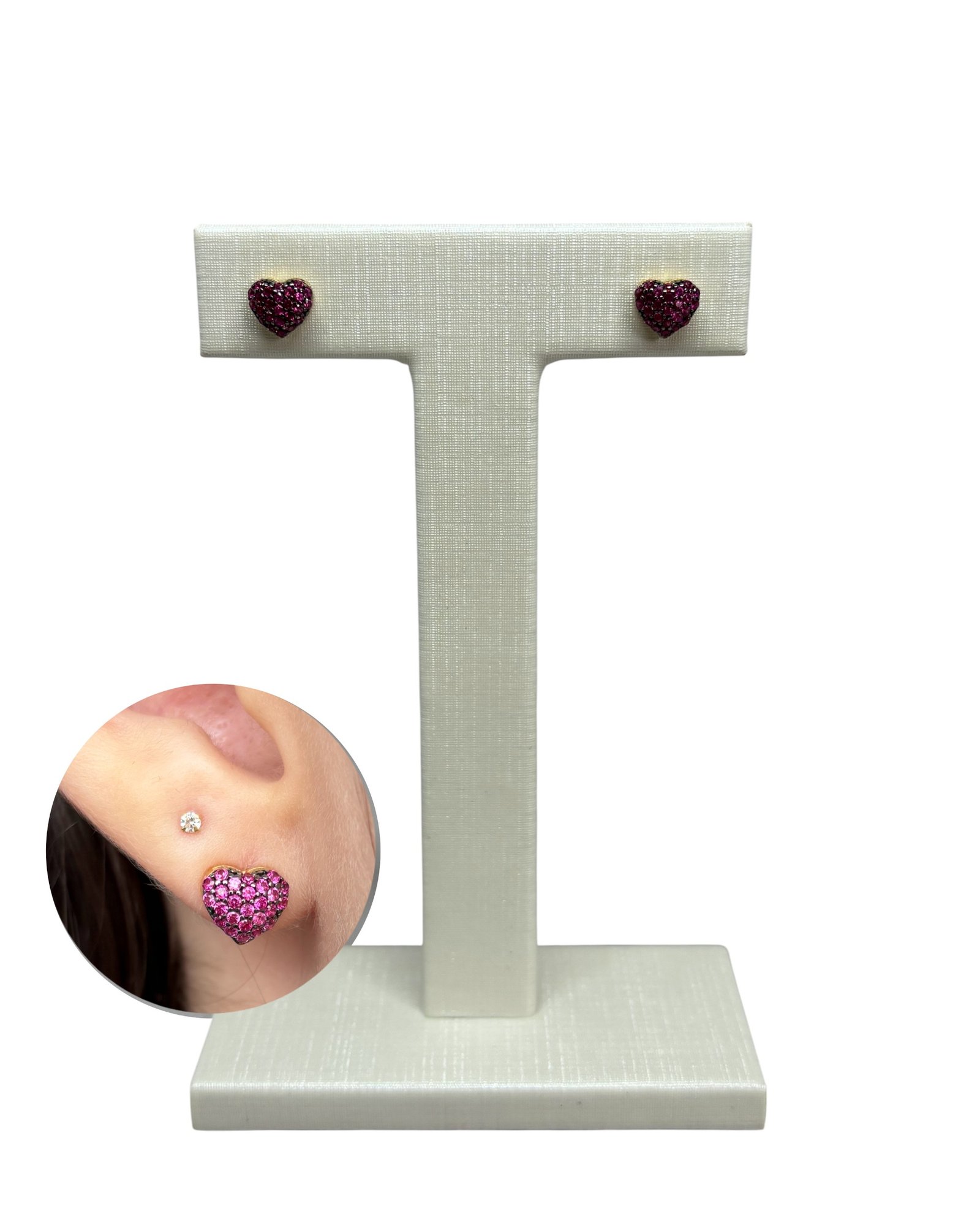 Brinco chuveiro coração galeria em ouro 18k cravejado com rubis.