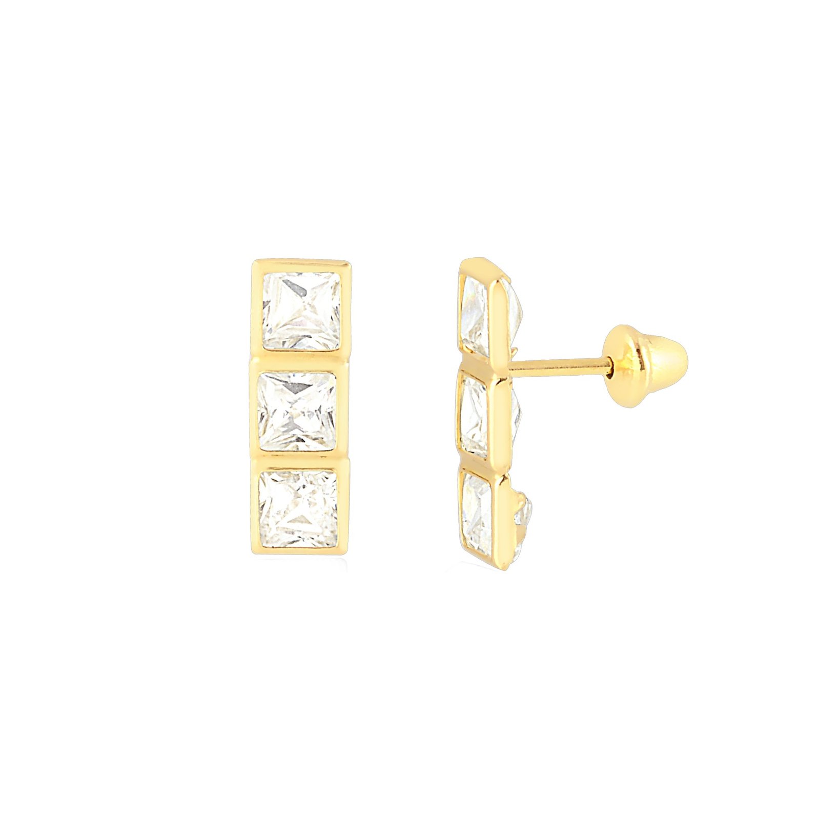 Brinco trio de zircônias quadradas em ouro 18k.