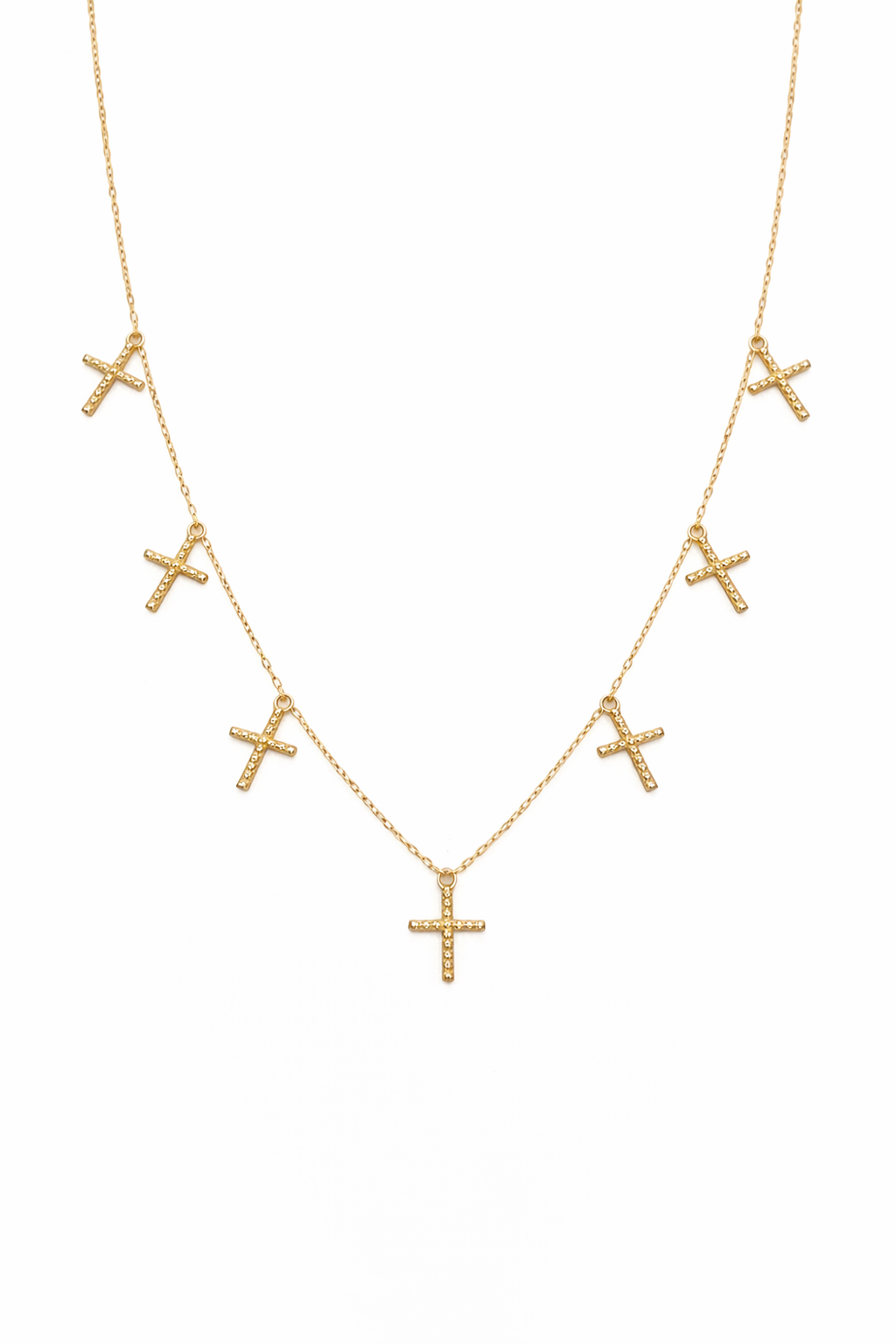 Corrente elo português de 40/45cm com 7 cruzes bolinhas penduradas em ouro 18k.