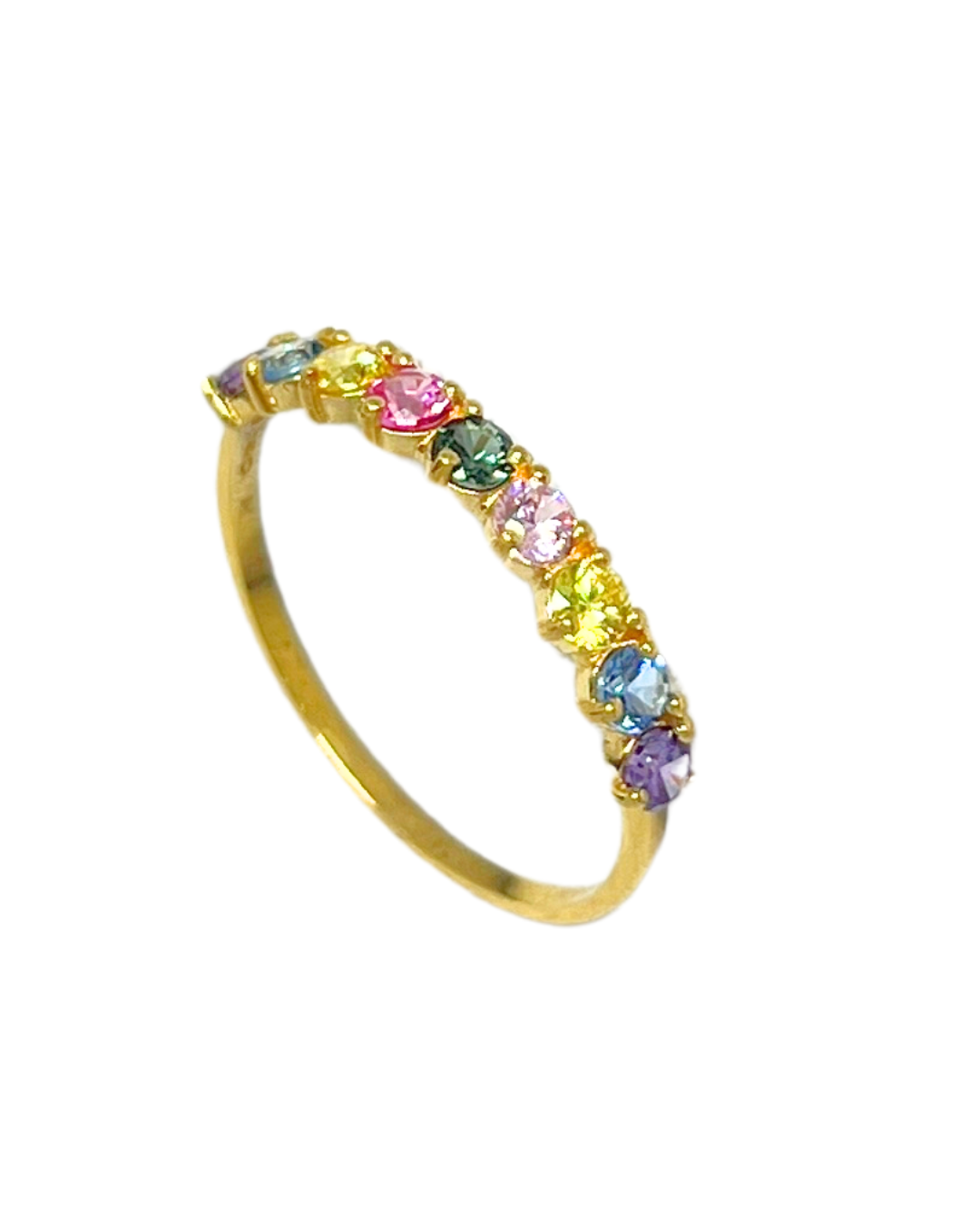Meia aliança em ouro 18k com zircônias coloridas.