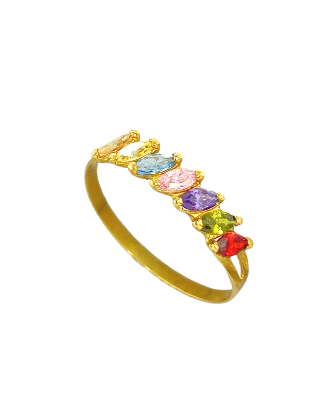 Meia aliança em ouro 18k com zircônias coloridas navetes.